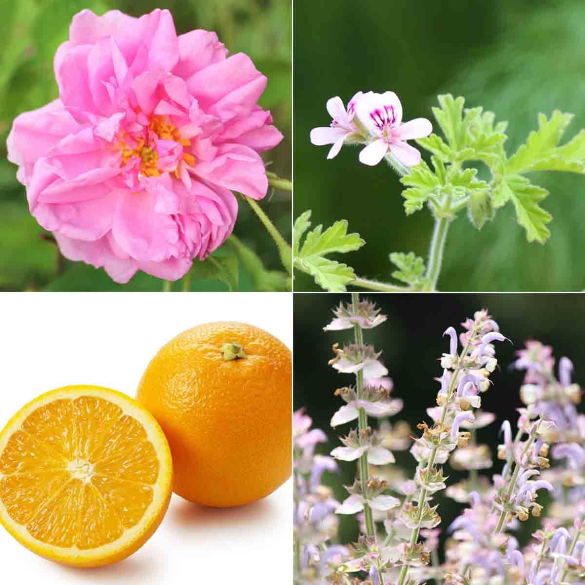 ローズabs精油、パルマローザ精油、スイートオレンジ精油、ゼラニウム精油、サイプレス精油、クラリセージ精油